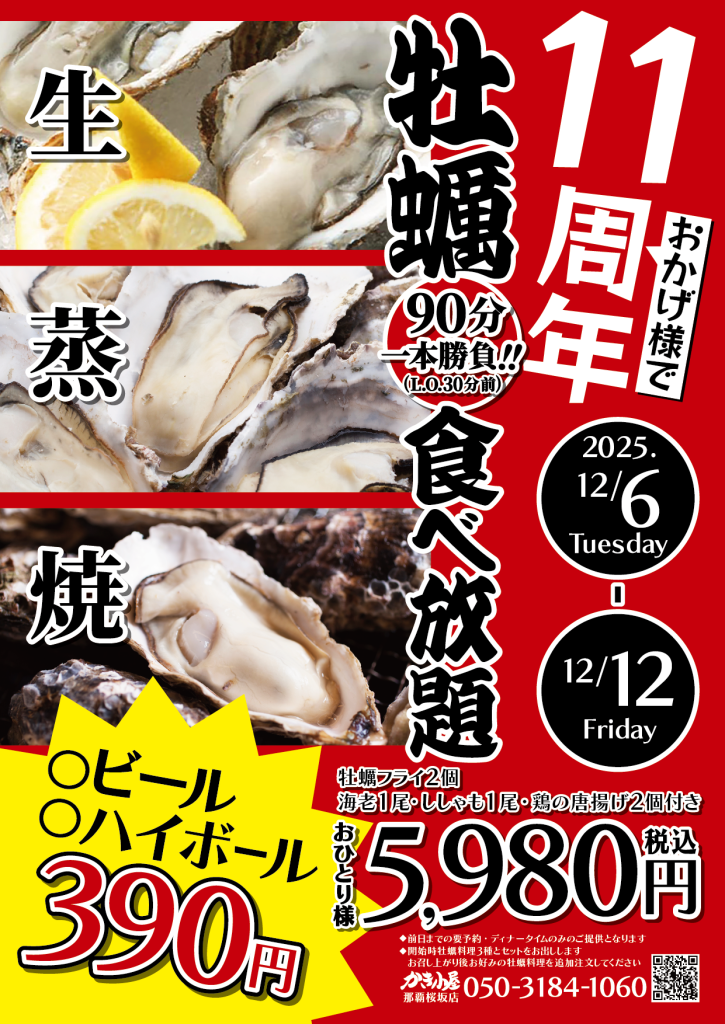 【かき小屋那覇桜坂】おかげ様で11周年! 生牡蠣・蒸し牡蠣・焼き牡蠣 食べ放題!!