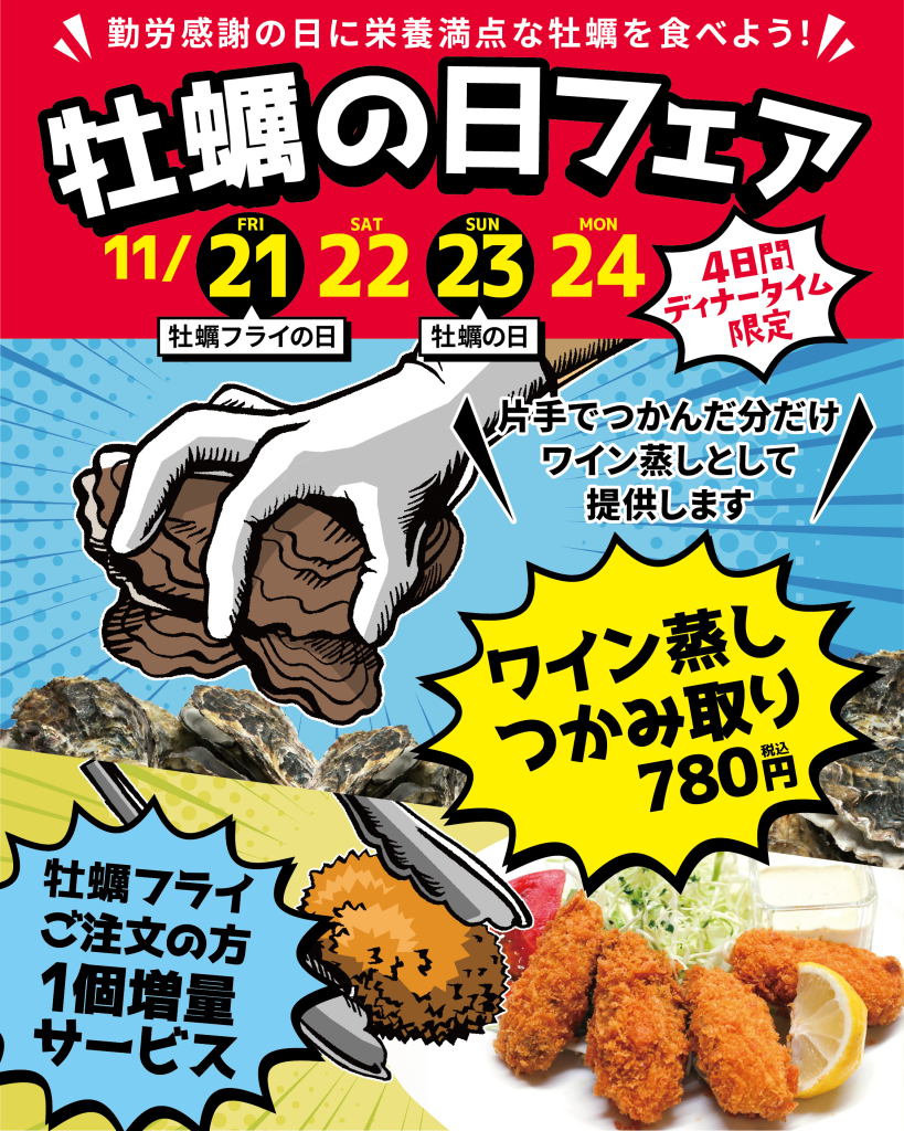 11月21日(金)から24日(月)の4日間限定で「牡蠣の日フェア」を行います。
