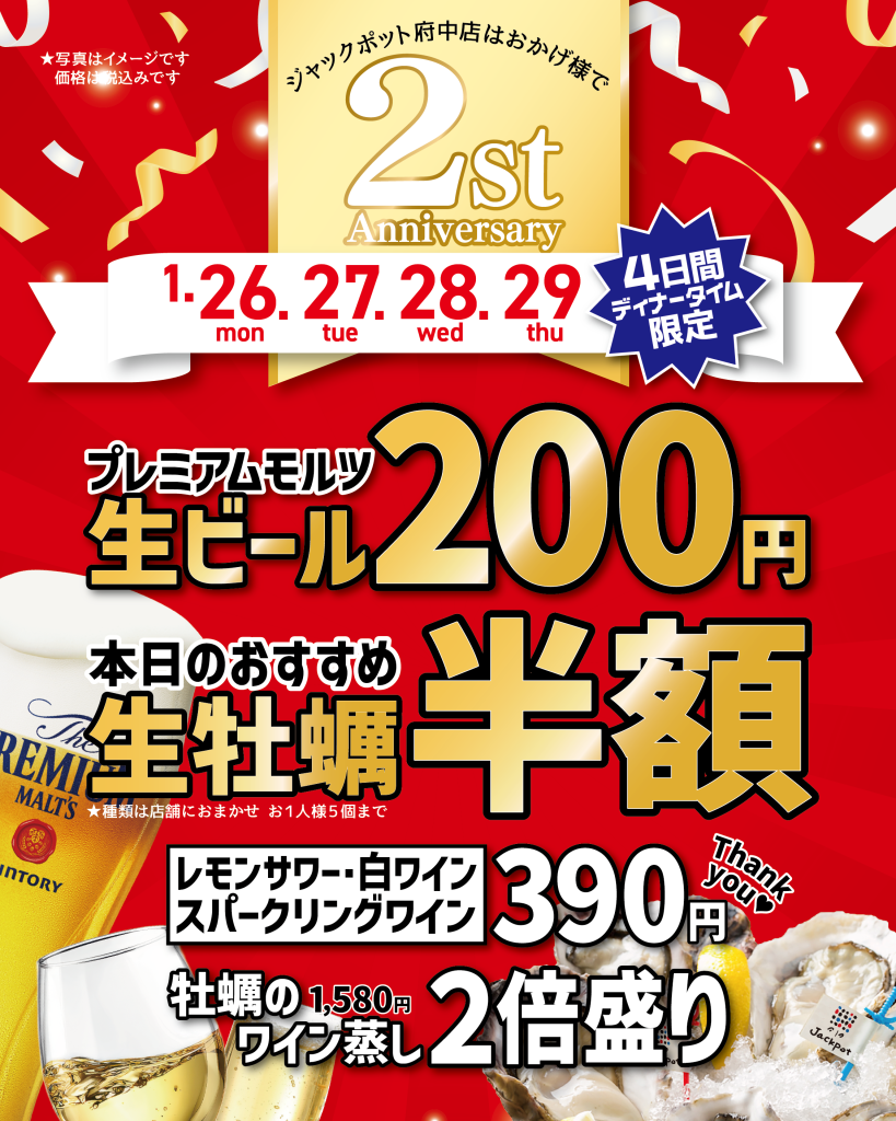 【本日のディナータイムから開催!】ジャックポット府中2周年感謝フェアを開催!