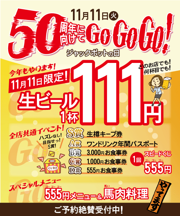 【11月11日はジャックポットの日!】今年もやります!生ビール111円!!