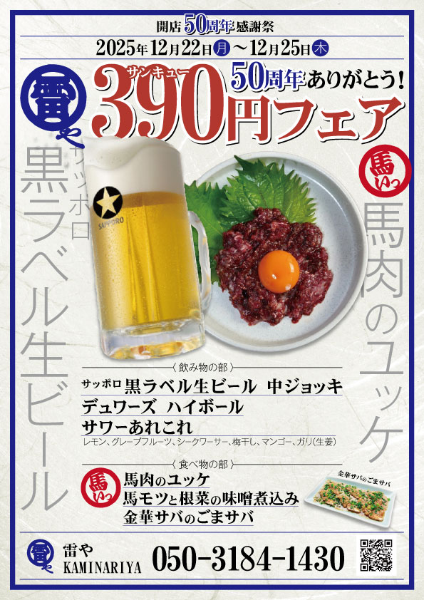 【12月22日(月)~25日(木)開催!】下北沢・雷やで50周年感謝フェアを開催!